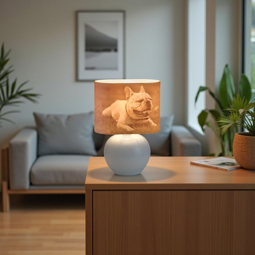 Ez a különleges lámpa nemcsak világít, hanem művészi értéket és személyes jelentést is ad otthonodnak. A fény lágyan szűrődik át a fotóval nyomtatott burán, különleges fény-árnyék játékot vetítve – így minden este meghitt hangulatot teremt.