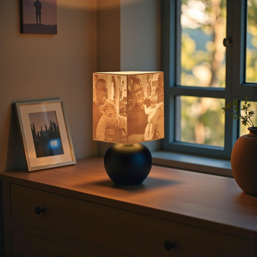 Ez a különleges lámpa nemcsak világít, hanem művészi értéket és személyes jelentést is ad otthonodnak. A fény lágyan szűrődik át a fotóval nyomtatott burán, különleges fény-árnyék játékot vetítve – így minden este meghitt hangulatot teremt.