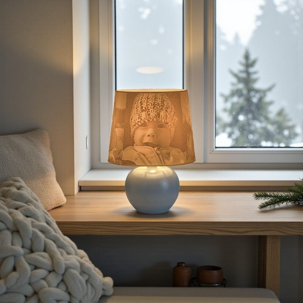 Ez a különleges lámpa nemcsak világít, hanem művészi értéket és személyes jelentést is ad otthonodnak. A fény lágyan szűrődik át a fotóval nyomtatott burán, különleges fény-árnyék játékot vetítve – így minden este meghitt hangulatot teremt.