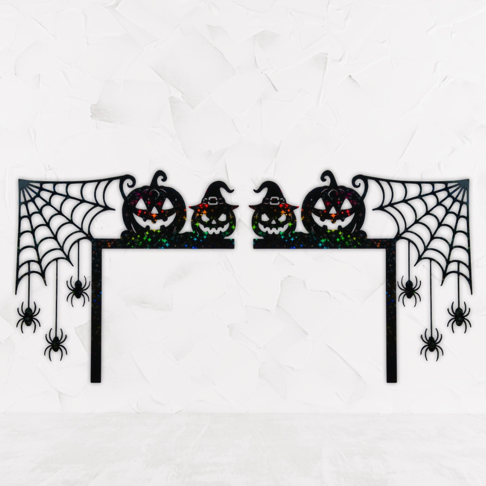 A Pókhálós Halloween Ajtó Dekoráció a klasszikus Halloween hangulatot idézi meg: hatalmas pókháló, három lógó pók és két vigyorgó tökfej egy kompozícióban. Az ajtód tetején elhelyezve azonnal ünnepi, mégis misztikus atmoszférát teremt.