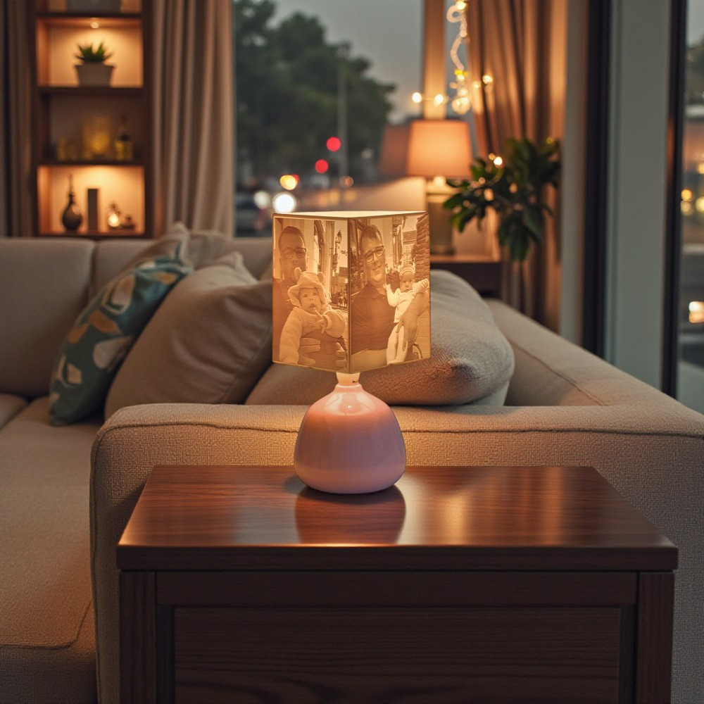 Kikapcsolva modern, stílusos Hasáb dísz – felkapcsolva pedig megelevenedik a varázslat: a választott fényképed részletgazdag, meleg fényben ragyog fel.