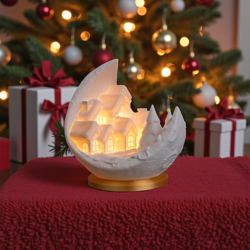 Van valami végtelenül megnyugtató abban, ha felnézünk a téli éjszakai égre. A "Holdbéli Mese" lámpa ezt a földöntúli békét hozza el a nappalidba vagy az éjjeliszekrényedre. Egy apró, hófödte falu, amely biztonságban bújik meg egy hatalmas, kráteres félhold oltalmában – mintha egy másik, békésebb világba pillantanánk be.