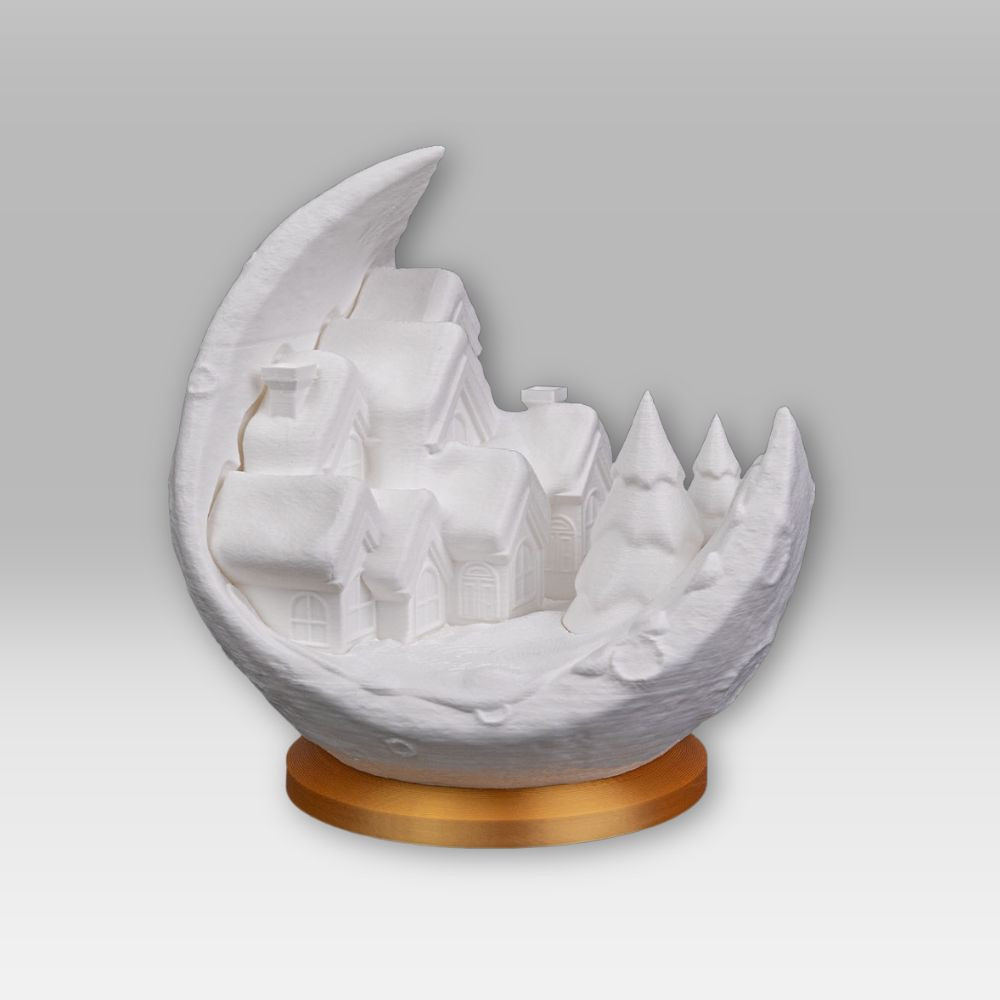 - Egyedi Design: A részletgazdag, 3D nyomtatott holdfelszín textúrája és a sima, hófödte házikók kontrasztja művészi megjelenést kölcsönöz neki. Az arany színű talp elegáns lezárást ad.