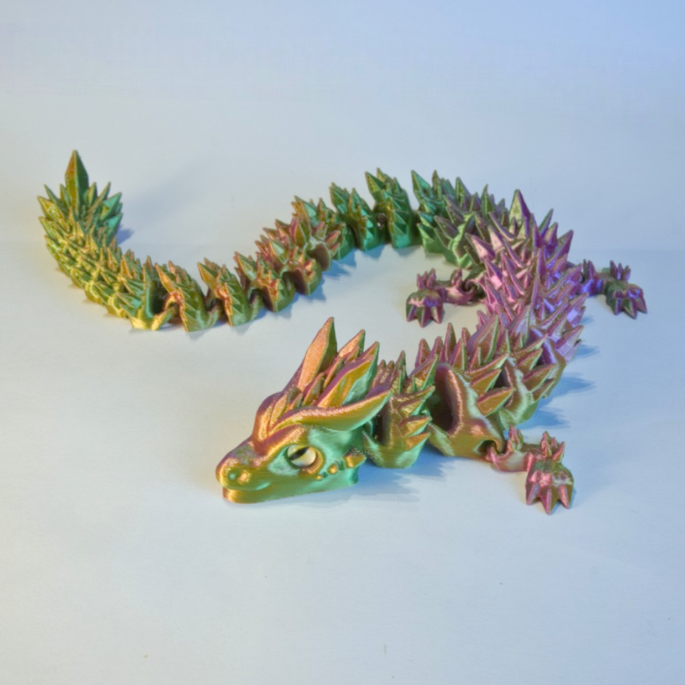 A PLA egy kemény, tartós műanyag. A sárkány bírja a mindennapi mozgatást, "gyűrődést". Ugyanakkor a kristálytüskék hegyesek lehetnek, és leejtéskor (kemény padlóra) sérülhetnek, így bánj vele úgy, mint egy értékes dísztárggyal!
