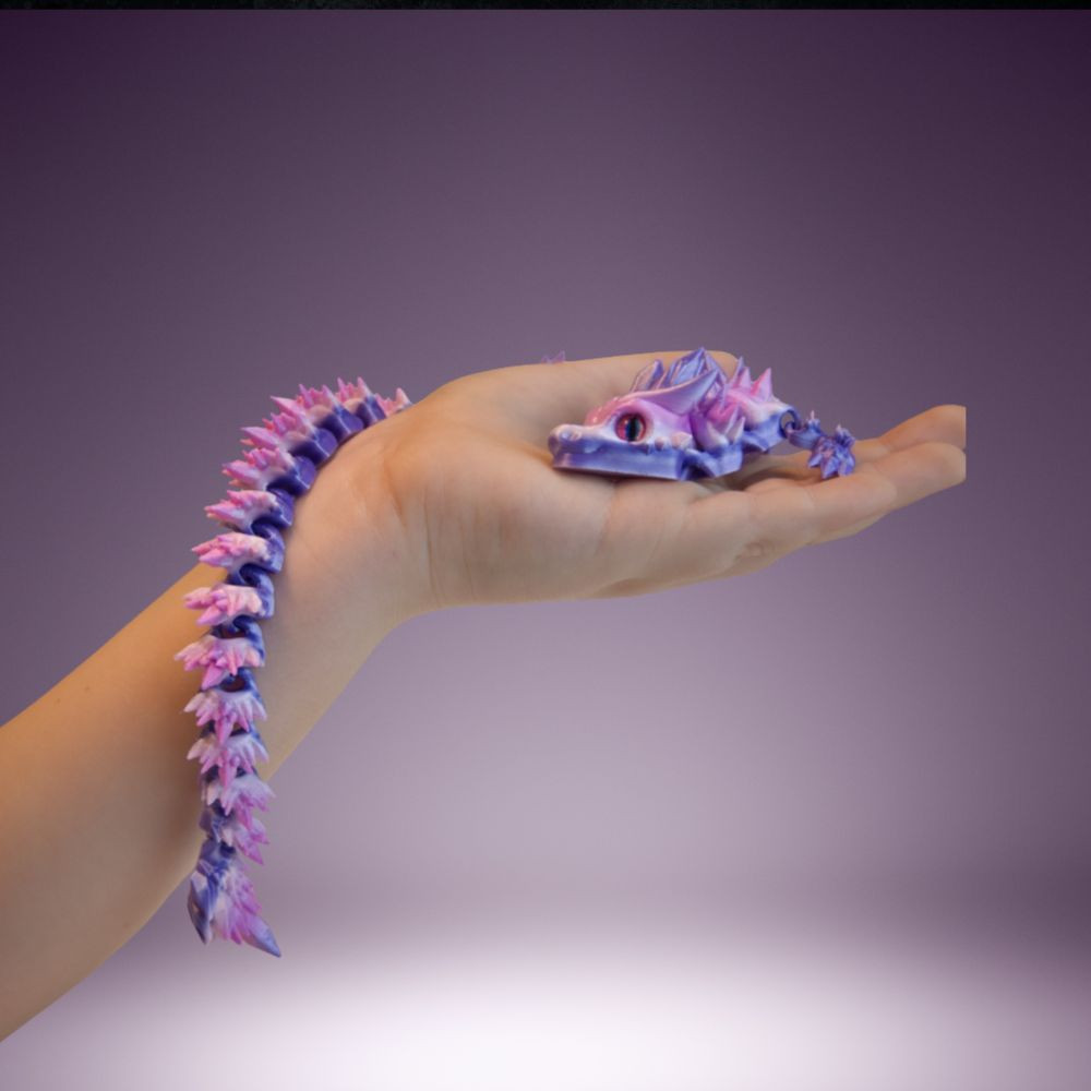 A PLA egy kemény, tartós műanyag. A sárkány bírja a mindennapi mozgatást, "gyűrődést". Ugyanakkor a kristálytüskék hegyesek lehetnek, és leejtéskor (kemény padlóra) sérülhetnek, így bánj vele úgy, mint egy értékes dísztárggyal!