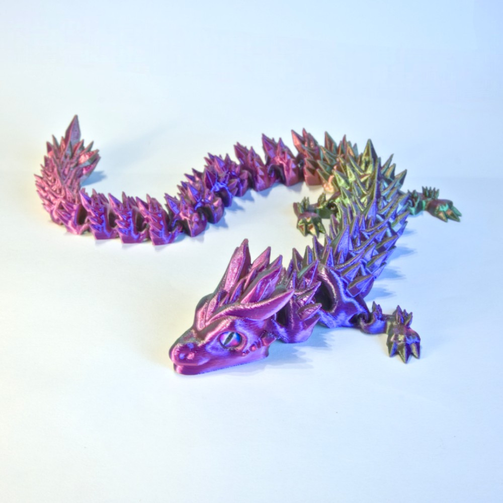 A PLA egy kemény, tartós műanyag. A sárkány bírja a mindennapi mozgatást, "gyűrődést". Ugyanakkor a kristálytüskék hegyesek lehetnek, és leejtéskor (kemény padlóra) sérülhetnek, így bánj vele úgy, mint egy értékes dísztárggyal!