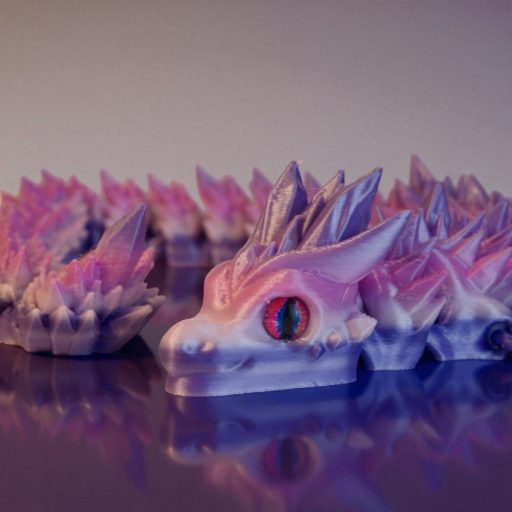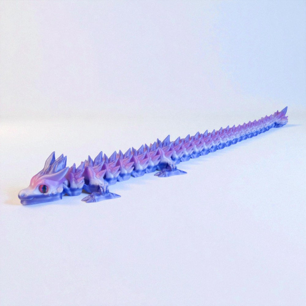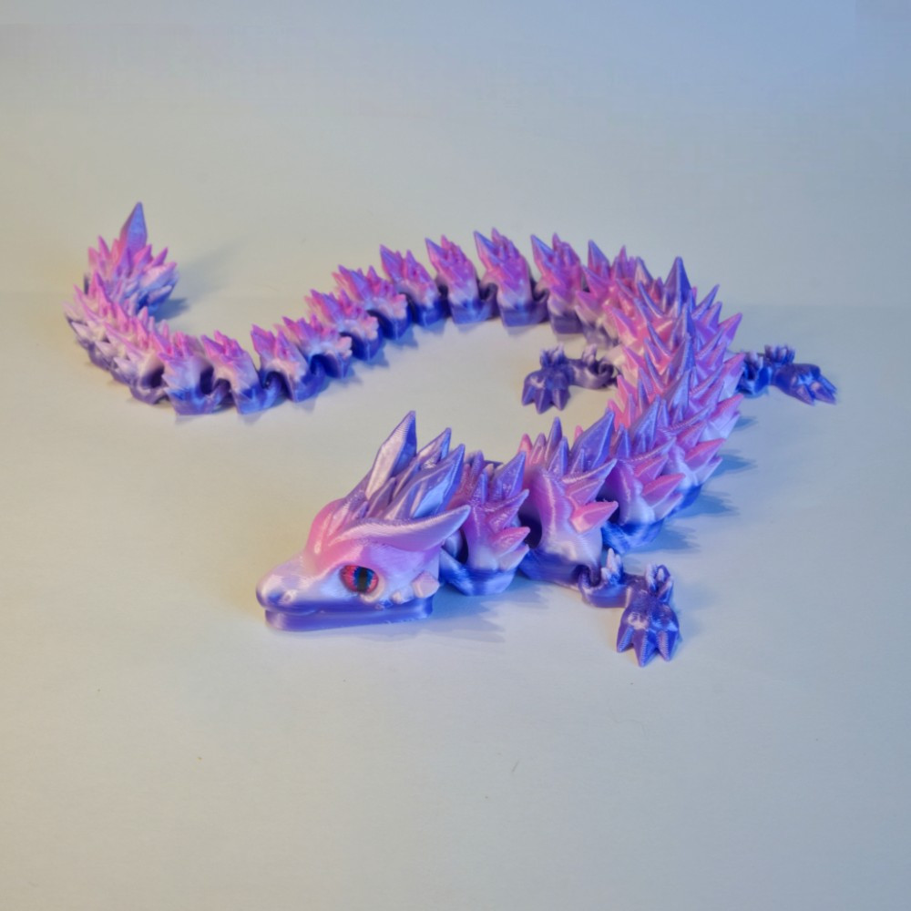 A PLA egy kemény, tartós műanyag. A sárkány bírja a mindennapi mozgatást, "gyűrődést". Ugyanakkor a kristálytüskék hegyesek lehetnek, és leejtéskor (kemény padlóra) sérülhetnek, így bánj vele úgy, mint egy értékes dísztárggyal!