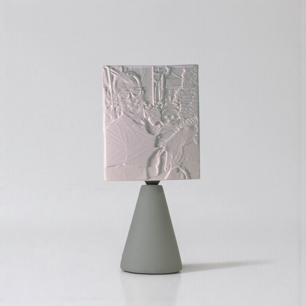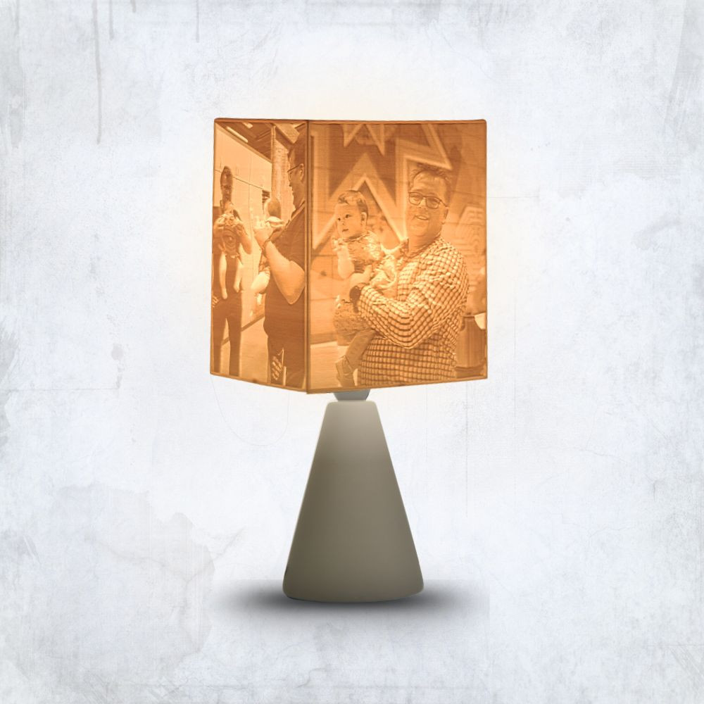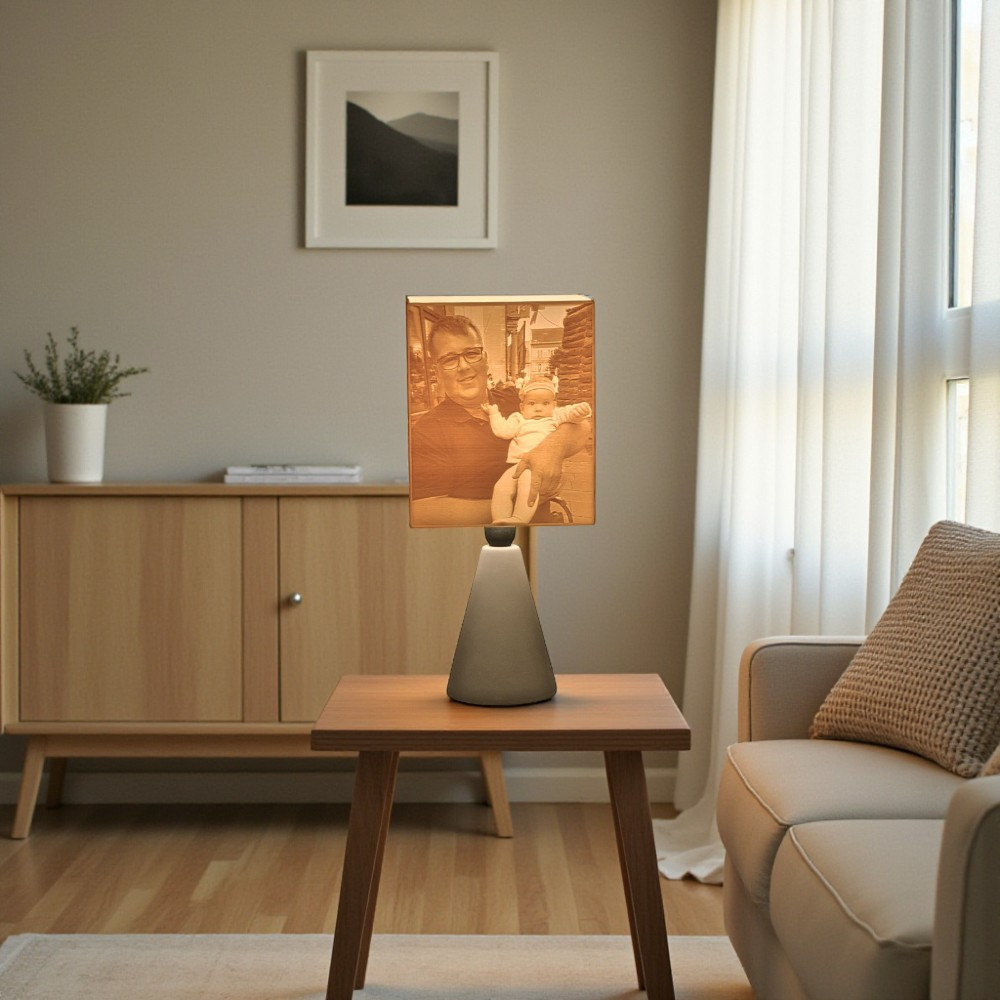 A kerámia lámpatest és a hengeres búra elegáns, visszafogott párost alkot. Nem tolakodó – hanem épp annyira van jelen, amennyire egy emléknek jelen kell lennie. A 3D nyomtatott litofán ernyő pedig életre kelti a fotódat, ahogy a fény átszűrődik rajta.