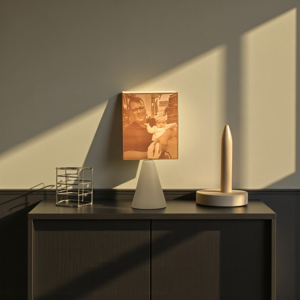 A kerámia lámpatest és a hengeres búra elegáns, visszafogott párost alkot. Nem tolakodó – hanem épp annyira van jelen, amennyire egy emléknek jelen kell lennie. A 3D nyomtatott litofán ernyő pedig életre kelti a fotódat, ahogy a fény átszűrődik rajta.