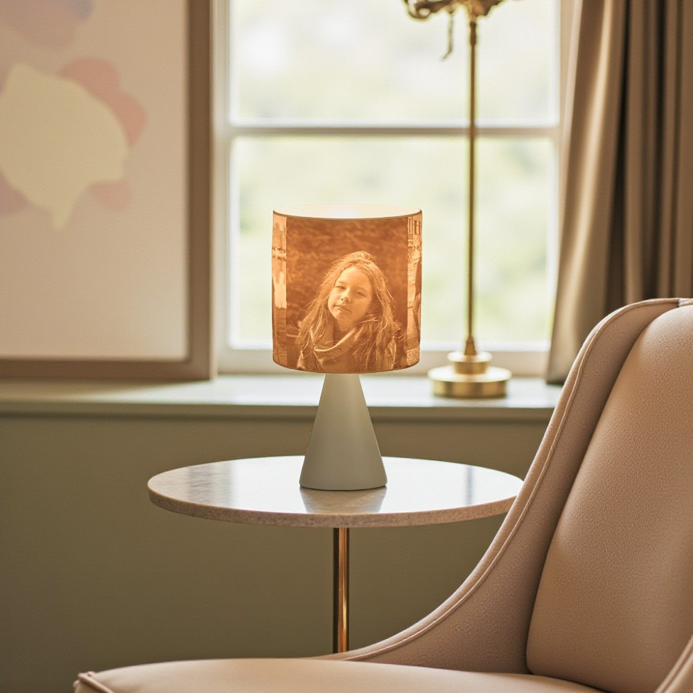 Ez a különleges lámpa nemcsak világít, hanem művészi értéket és személyes jelentést is ad otthonodnak. A fény lágyan szűrődik át a fotóval nyomtatott burán, különleges fény-árnyék játékot vetítve – így minden este meghitt hangulatot teremt.