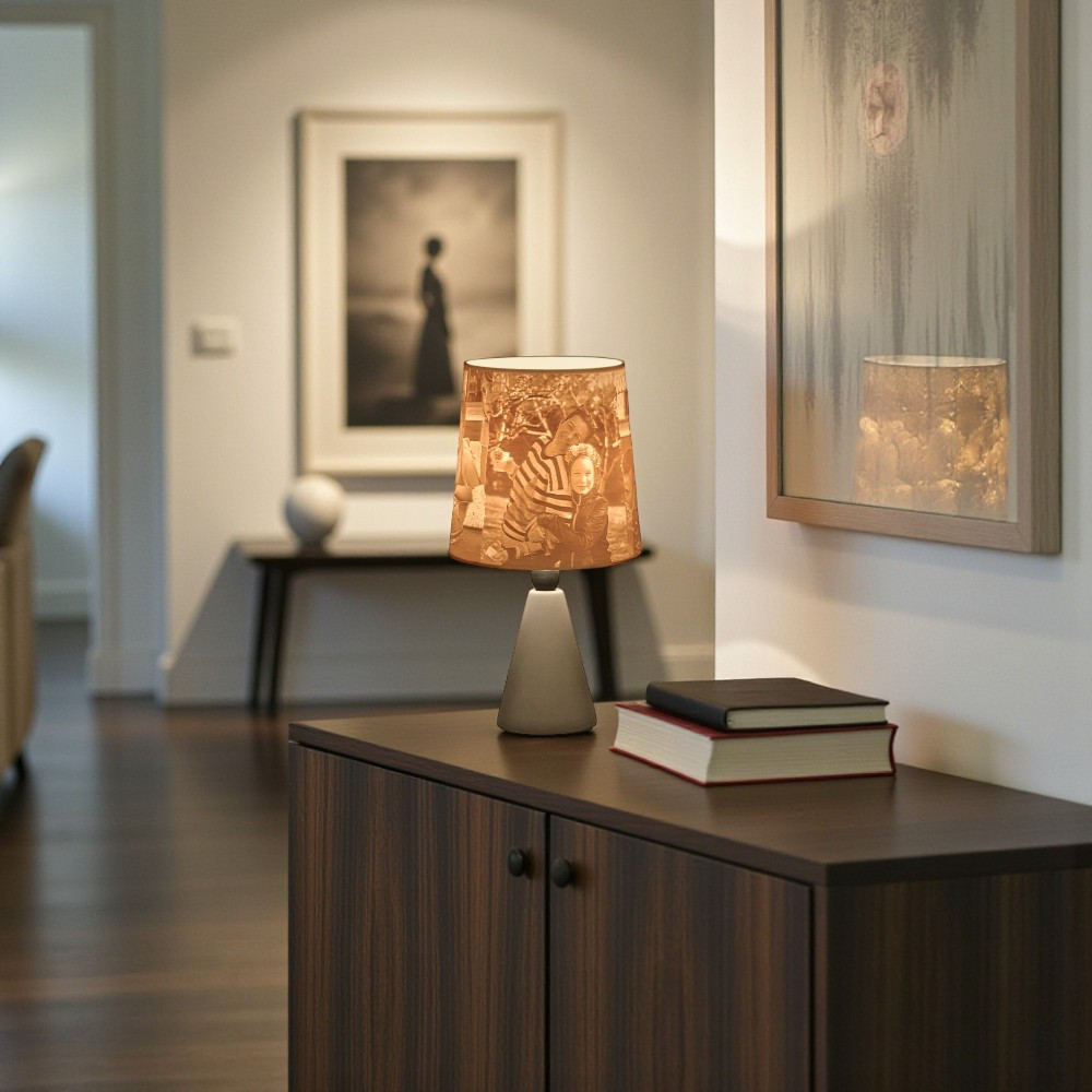 Ez a különleges lámpa nemcsak világít, hanem művészi értéket és személyes jelentést is ad otthonodnak. A fény lágyan szűrődik át a fotóval nyomtatott burán, különleges fény-árnyék játékot vetítve – így minden este meghitt hangulatot teremt.