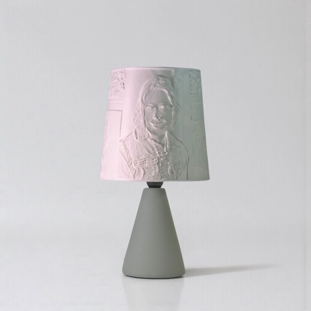 A kerámia lámpatest és a hengeres búra elegáns, visszafogott párost alkot. Nem tolakodó – hanem épp annyira van jelen, amennyire egy emléknek jelen kell lennie. A 3D nyomtatott litofán ernyő pedig életre kelti a fotódat, ahogy a fény átszűrődik rajta.