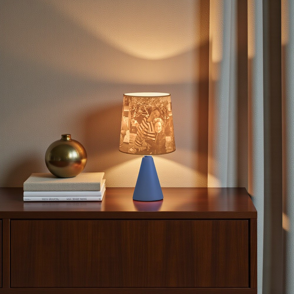 A Klasszikus Lámpaernyő az asztali világítás örök formavilágát ötvözi a modern litofán technológiával, így születik meg egy olyan fényforrás, amely egyszerre személyes, dekoratív és praktikus. Az ismerős, kúpos sziluett melegséget és időtlenséget sugároz, miközben a fényképeid minden apró részlete életre kel a meleg, lágy fény által.