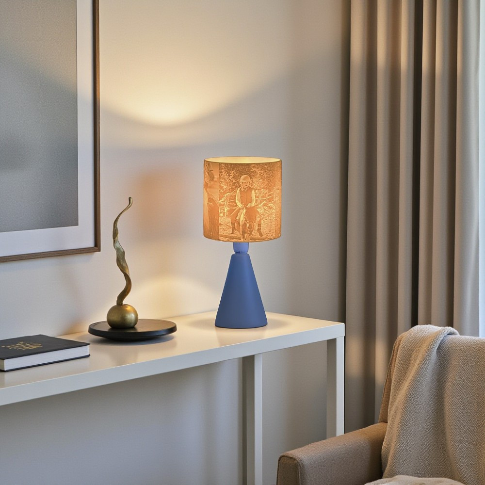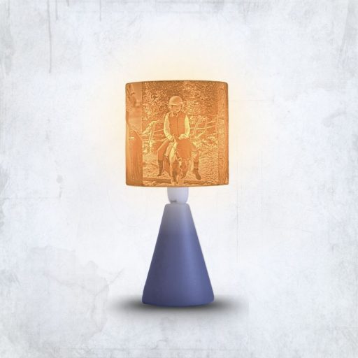 A kerámia lámpatest és a hengeres búra elegáns, visszafogott párost alkot. Nem tolakodó – hanem épp annyira van jelen, amennyire egy emléknek jelen kell lennie. A 3D nyomtatott litofán ernyő pedig életre kelti a fotódat, ahogy a fény átszűrődik rajta.