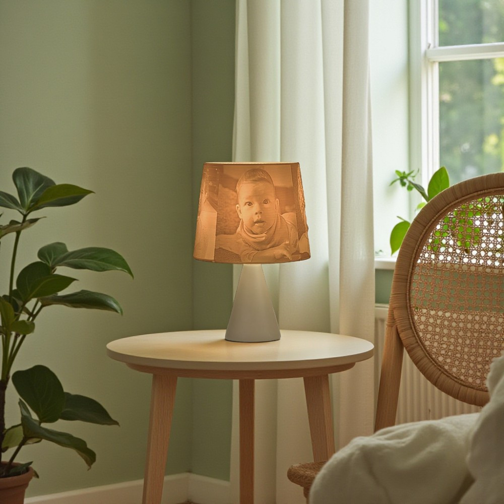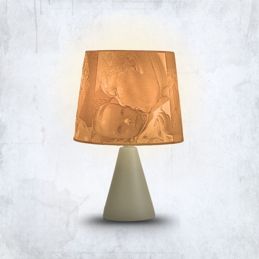 A kerámia lámpatest és a hengeres búra elegáns, visszafogott párost alkot. Nem tolakodó – hanem épp annyira van jelen, amennyire egy emléknek jelen kell lennie. A 3D nyomtatott litofán ernyő pedig életre kelti a fotódat, ahogy a fény átszűrődik rajta.