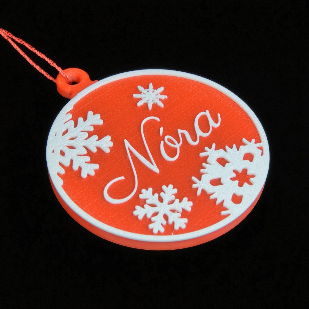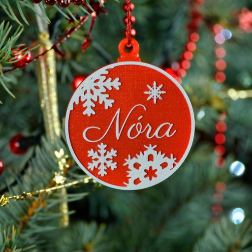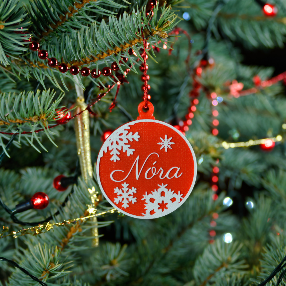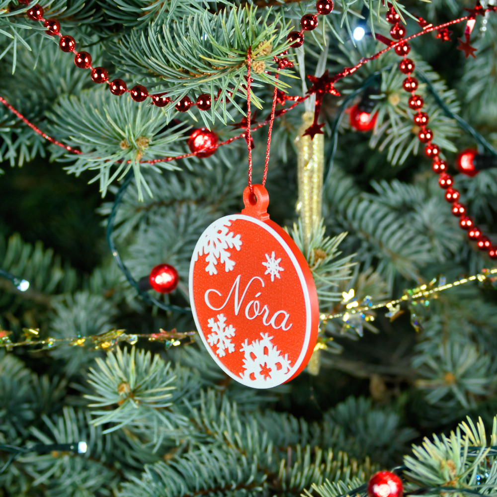 Minden egyes darab 3D nyomtatással készül PLA anyagból, gondos tervezéssel. A 8 cm átmérőjű, piros-fehér színvilágú díszt hópelyhek díszítik, az általad megadott névvel. Elegáns akasztózsinórral ellátva, így azonnal a fára helyezhető – vagy akár egy ajándékcsomagra is köthető.