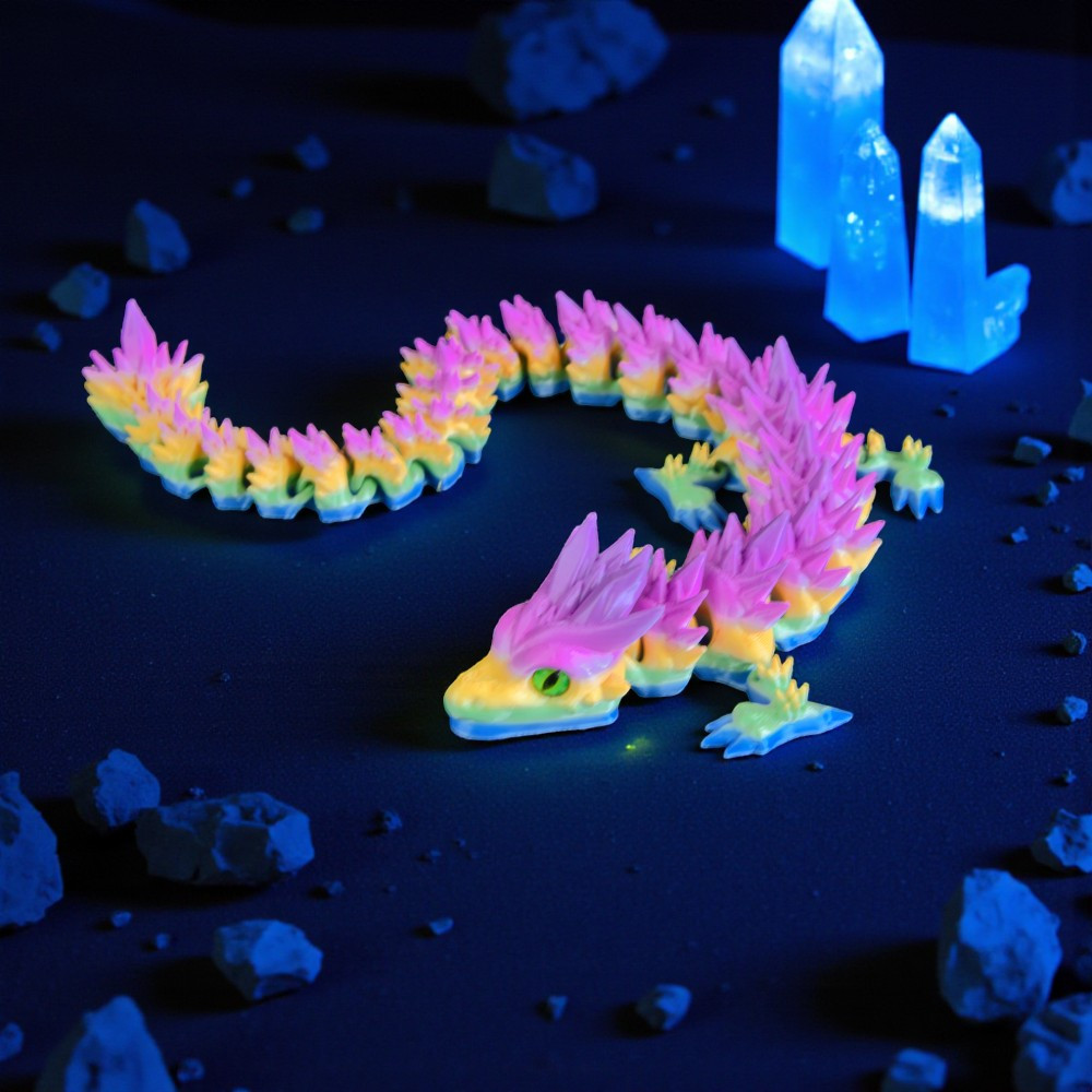 A PLA egy kemény, tartós műanyag. A sárkány bírja a mindennapi mozgatást, "gyűrődést". Ugyanakkor a kristálytüskék hegyesek lehetnek, és leejtéskor (kemény padlóra) sérülhetnek, így bánj vele úgy, mint egy értékes dísztárggyal!