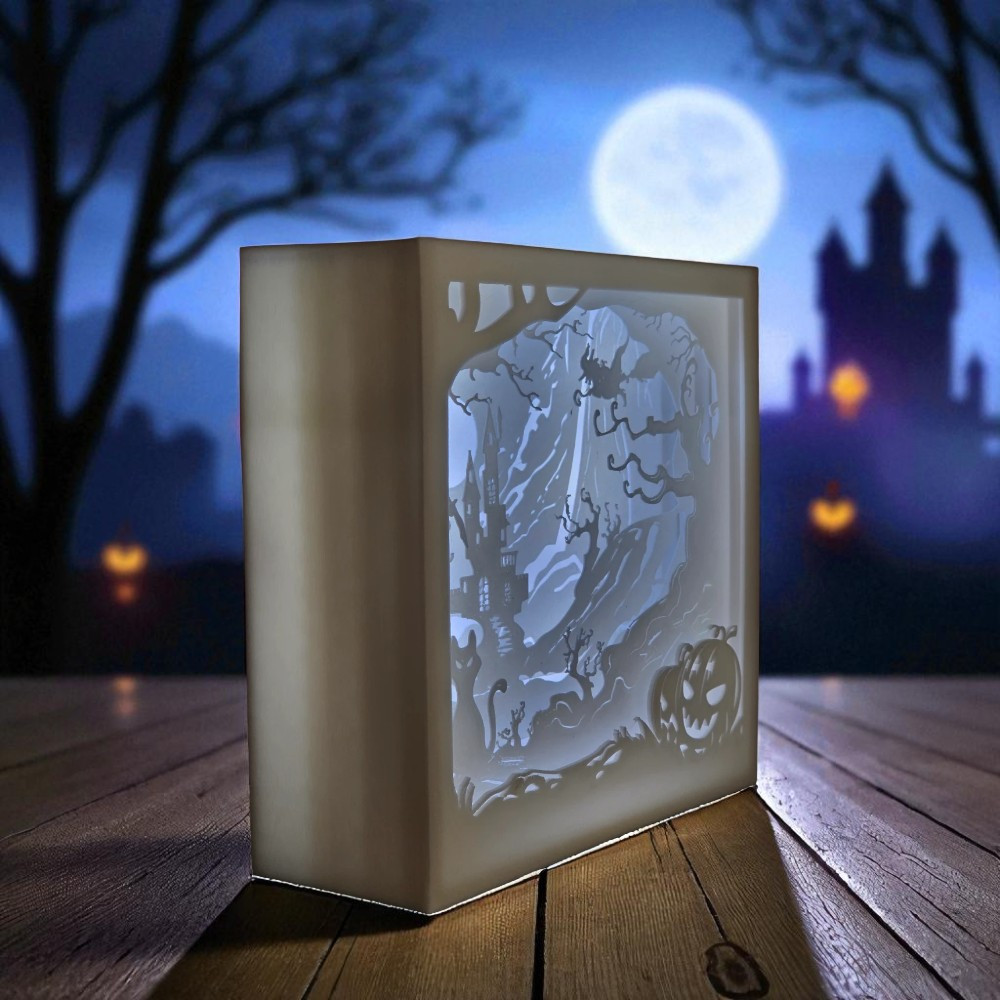 Sötétedés után az egész szoba atmoszférát vált. A rétegelt grafika térérzetet ad, szinte mozgásba lendül a jelenet a fények játékától. Tökéletes ablakpárkányra, komódra vagy gyerekszobába – egyszerre hátborzongató és csodálatos.